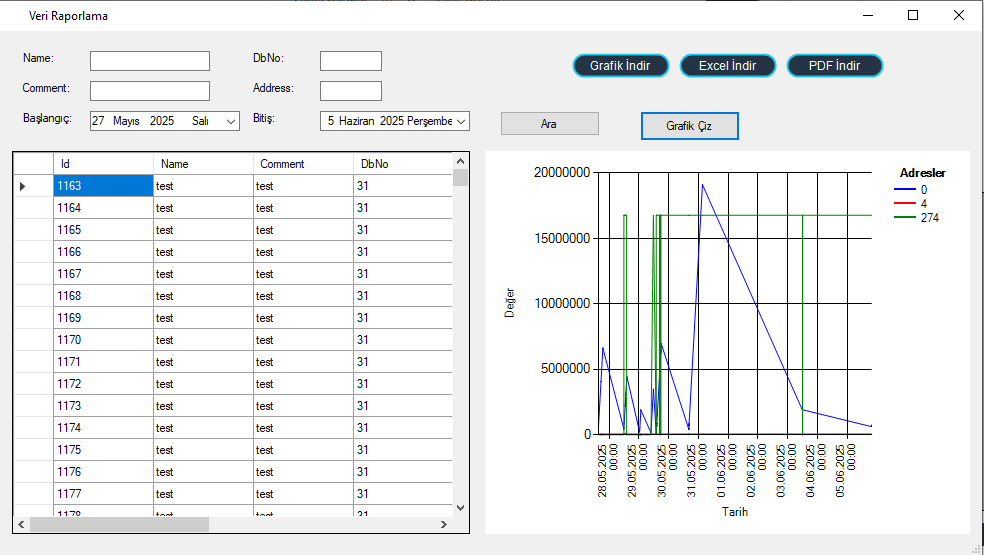 Sistem, kullanıcıların PLC’den gelen ham verileri sadece görüntülemesini değil; aynı zamanda bu verileri anlamlandırmasını ve karar destek süreçlerinde etkin şekilde kullanmasını hedefler. Okunan veriler, anlık olarak güncellenen tablolar ve grafikler üzerinden sunularak üretim süreçlerindeki değişimler net biçimde izlenebilir hale getirilir. Bu yapı, üretim performansının değerlendirilmesi, süreç optimizasyonu ve olası hataların erken aşamada tespit edilmesi açısından önemli avantajlar sağlar.